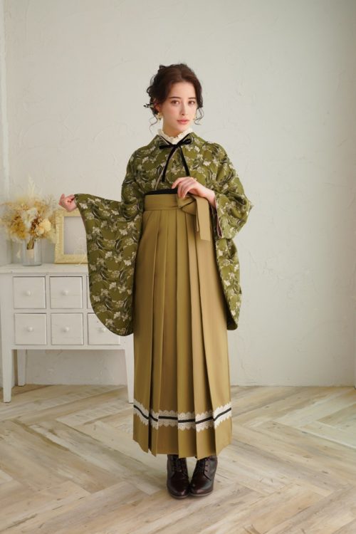 袴はお着物より薄めのカーキ色でレースがアクセントに入っております♪