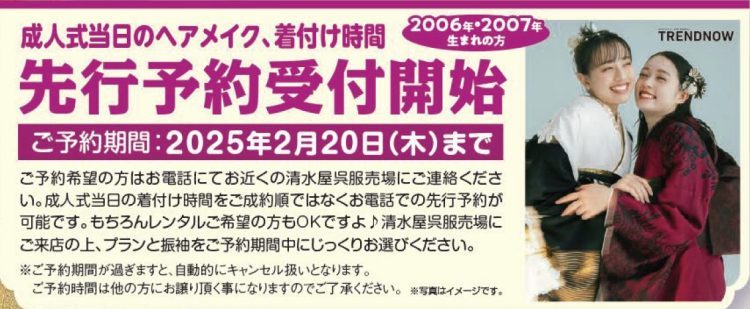 成人式当日のヘアメイク、着付け時間 先行予約受付開始