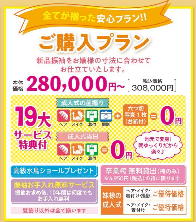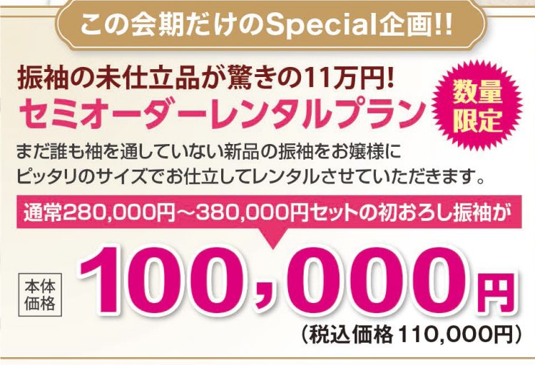 新品振袖をお嬢様の寸法(5タイプのサイズ)に合わせてお仕立てしてレンタルしていただくプランです。