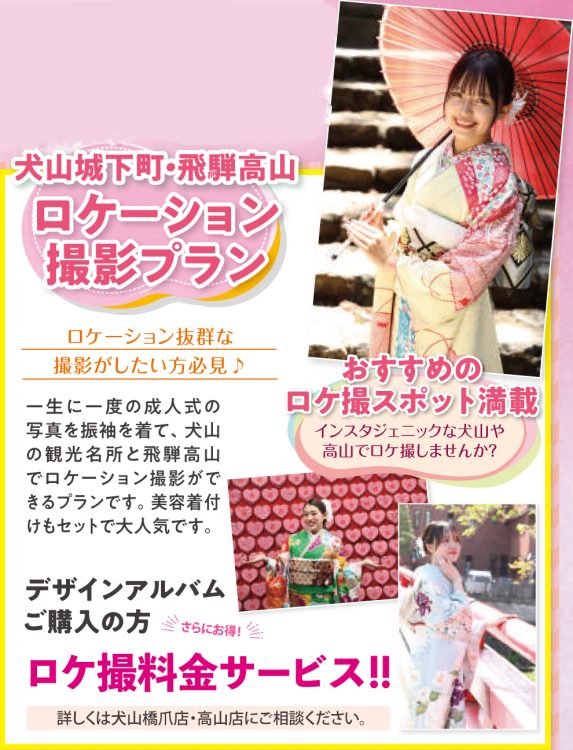 一生に一度の成人式の写真を振袖を着て、犬山の観光名所と飛騨高山でロケーション撮影ができるプランです。美容着付けもセットで大人気です。