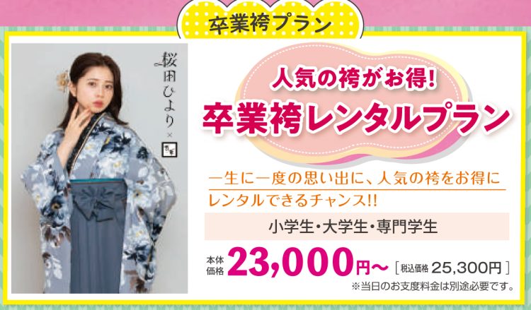 一生に一度の大切な思い出に、人気の袴をお得にレンタルできるプランです。