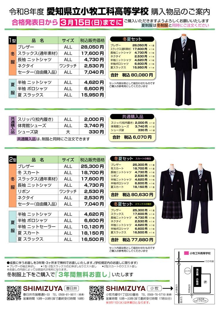 令和8年度 愛知県立小牧工科高等学校 制服のご案内