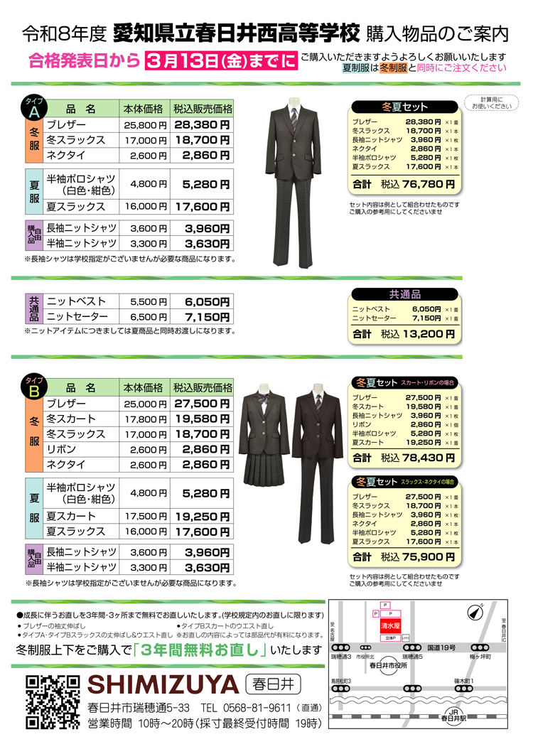 令和8年度 愛知県立春日井西高等学校 制服のご案内