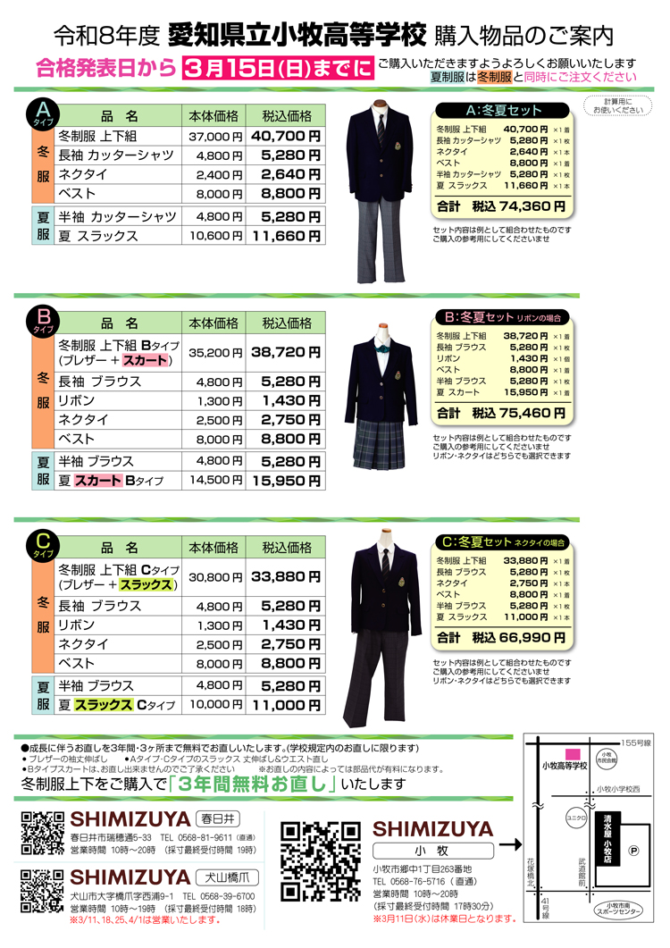 令和8年度 愛知県立小牧高等学校 制服のご案内