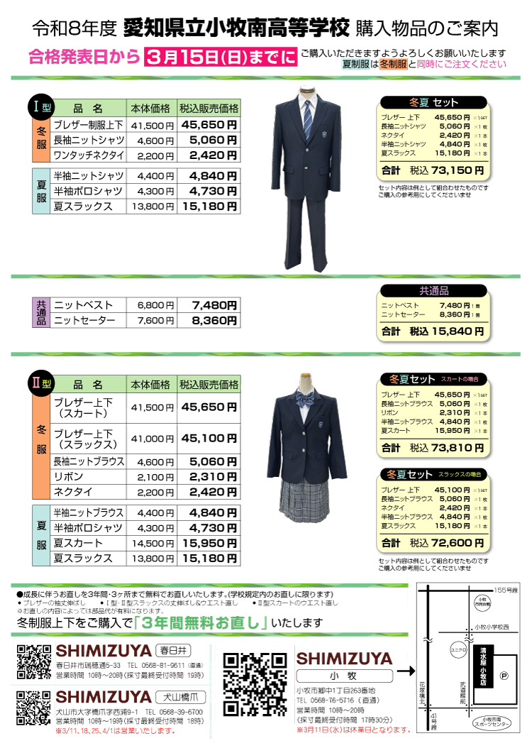 令和8年度 愛知県立小牧南高等学校 制服のご案内